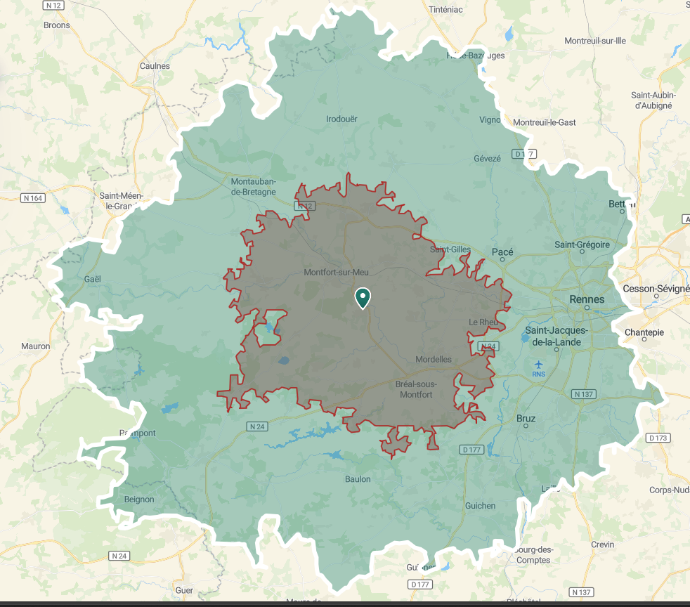 Rennes, Saint-Jacques-de-la-Lande, Chavagne, Bréal-sous-Monfort, Saint-Thurial, Maxent, Pont-Réan, Plélan-le-Grand, Chartres-de-Bretagne, Couédouan, Saint-Malode Beignon, Saint-Raoul, Paimpont, Concoret, Treffendel, Monterfil, Le Verger, Mordelles, Lassy, Le Rheu, Goven, Baulon, Guichen, Vezin-le-Coquet, L’Hermitage, Cintré, Talensac, Saint-Malon-sur-Mel, Bléruais, Saint-Gonlay, Gaël, Guer, Muel, Saint-Maugan, Iffendic, Montfort-sur-Meu, Breteil, Pacé, Saint-Gilles, La Nouaye, Boisgervilly, Montauban-de-Bretagne, Bédée, Clayes, Parthenay-de-Bretagne, Romillé, La Chapelle-du-Lou, Saint-M’Hervon, Irodouër, Langan, Brocéliande, Saint-Méen-le-Grand, Saint-Grégoire…